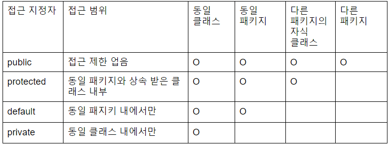 자바도 클래스의 멤버 각각에 외부에서 접근할 수 있는 범위를 지정하는 접근 지정자(access modifier)를 둘 수 있다. 다음과 같은 네 가지가 있다. 접근 지정자 접근 범위 동일 클래스 동일 패키지 다른 패키지의..