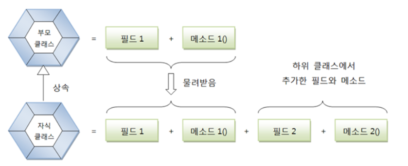 -> 부모 클래스에서 정의된 필드와 메소드를 자식클래스가 물려받는것.